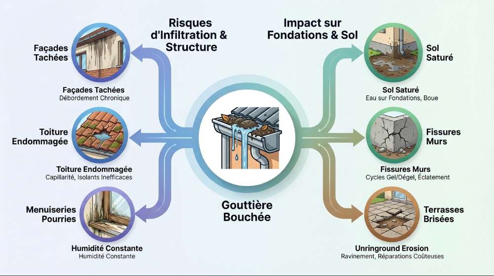 Une gouttière bouchée déverse des volumes d’eau importants au pied des murs. Le sol se gorge d’eau, l’humidité remonte par capillarité et les cycles gel/dégel fragilisent certaines maçonneries. Un entretien simple évite souvent des réparations nettement plus coûteuses.
